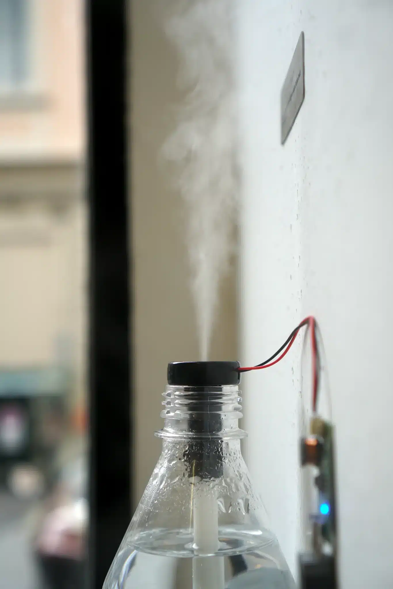In the space, the artist also produces a discreet intervention by vaporizing throughout the exhibition a tiny dose of carbon dioxide (CO2) obtained by heat-vaporizing in the laboratory a carat of rough diamond, another mineral resulting from volcanism, and the volume of which is equivalent to one minute of human exhalation.