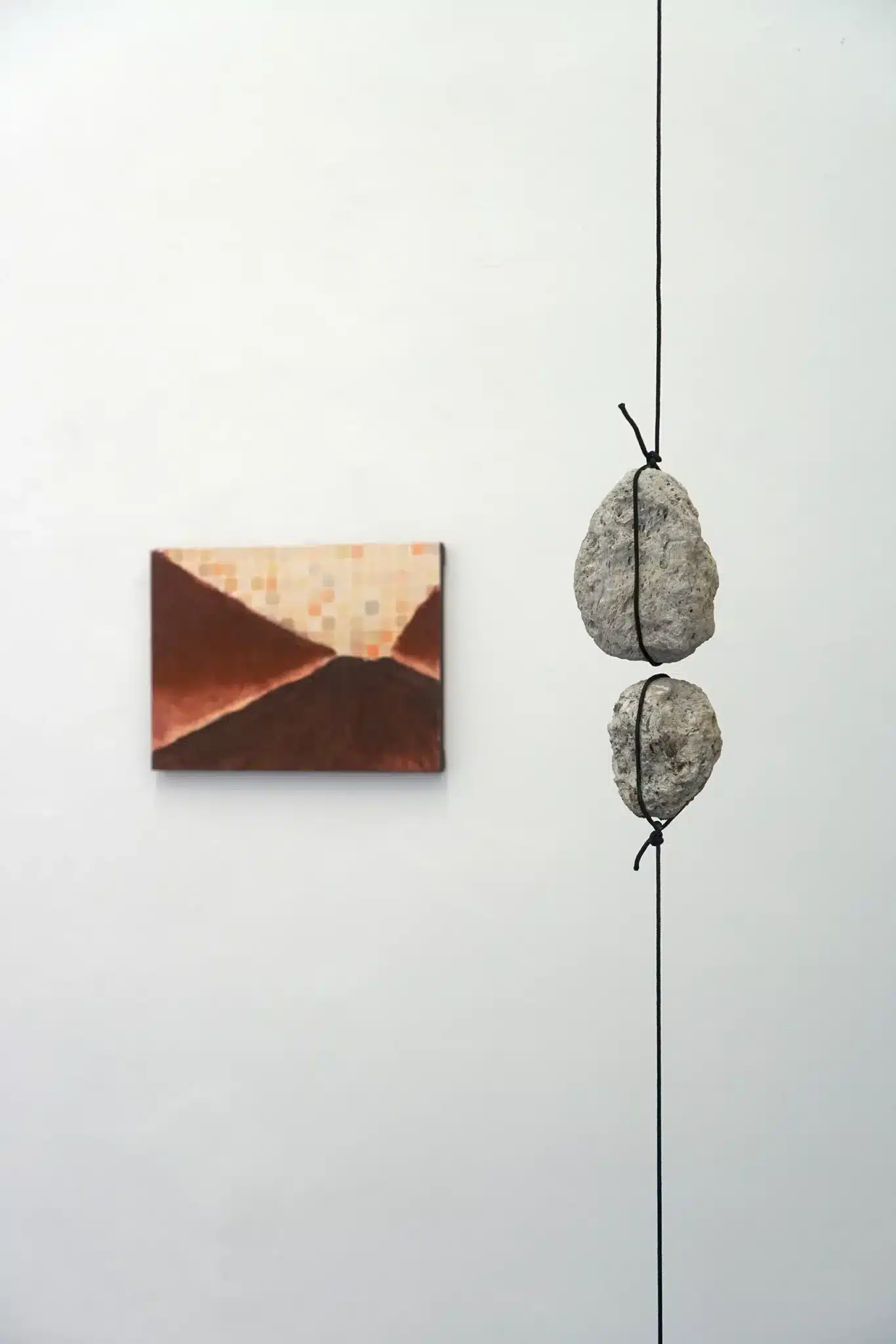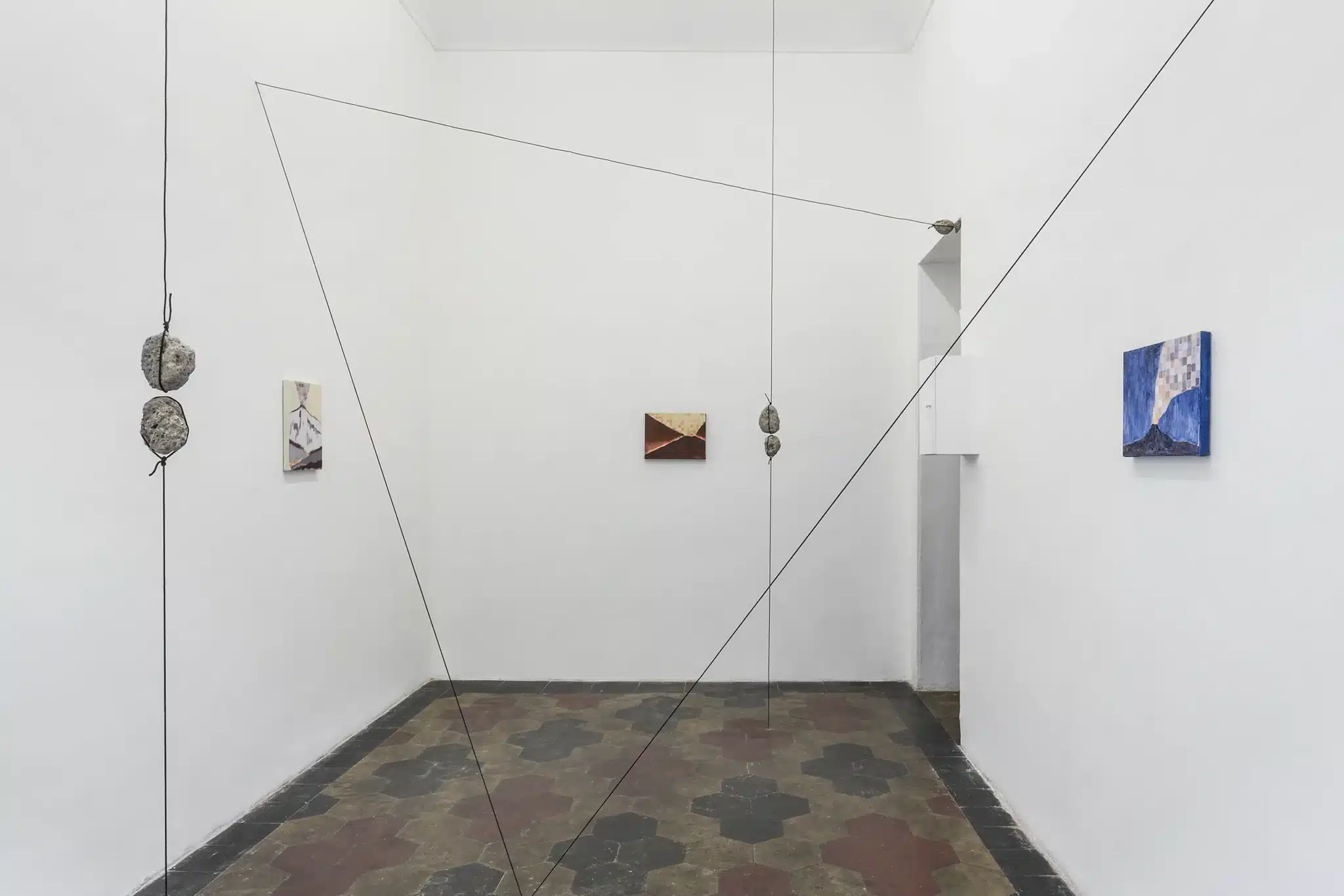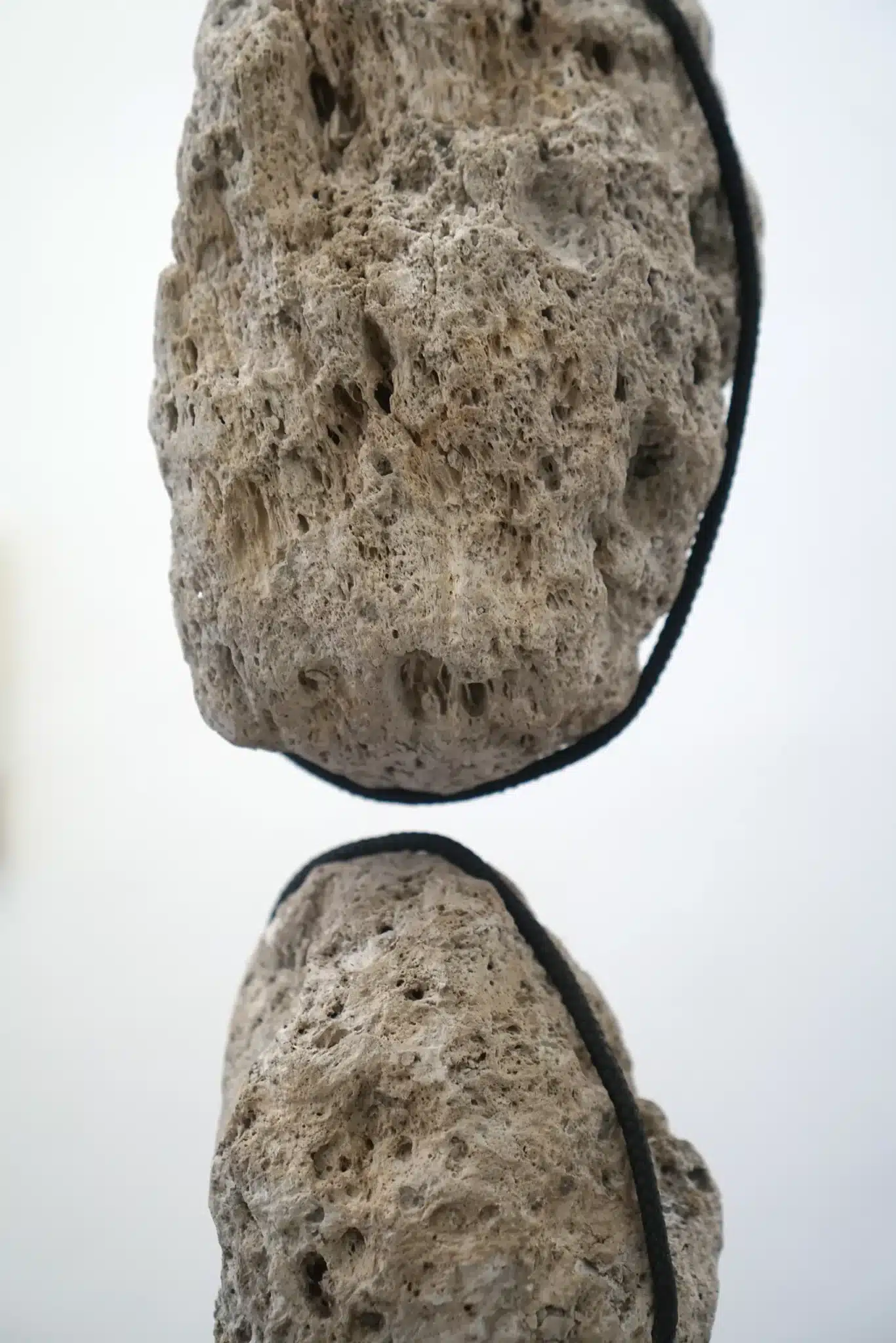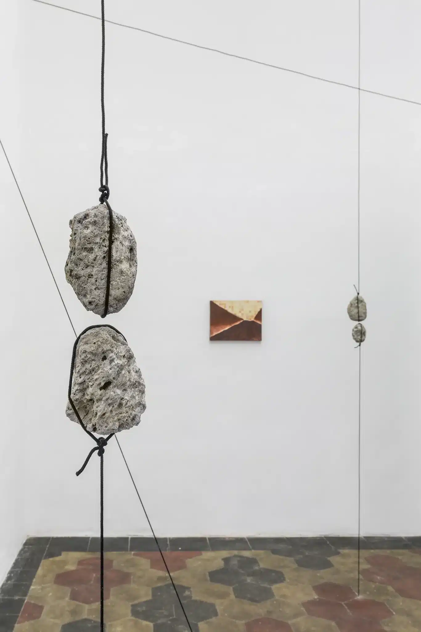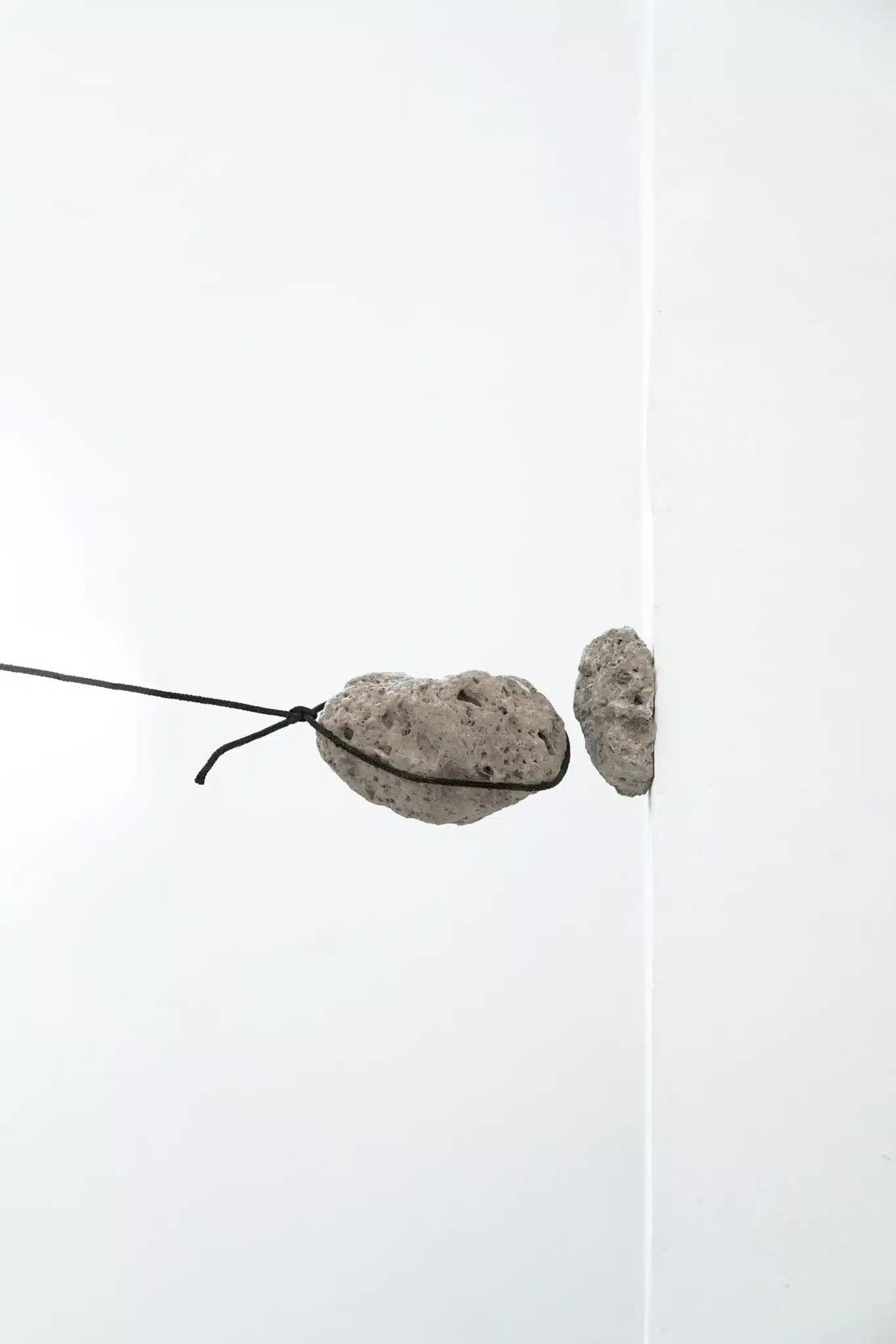 At Quartz Studio, Romain creates a site-specific installation com- posed of various volcanic stones disconcertingly floating in the air thanks to invisible magnetic forces. The black ropes that connect the stones to the space draw precarious lines that redefine the circulation possibilities inside the space and reveal a choreographic exercise of tension and balance.